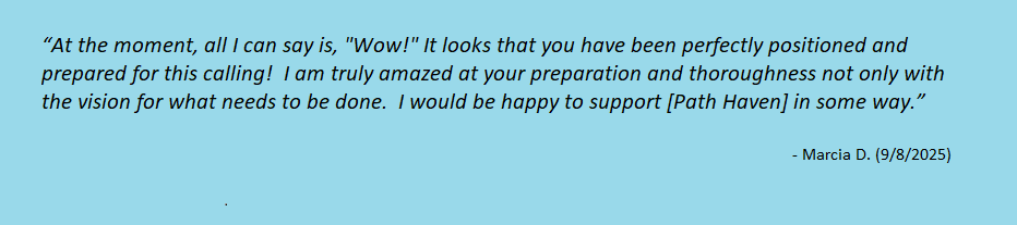 Sponsors and donors may click the “Donate” button to support regularly online. Use a debit/ATM card or credit card to complete your online monetary transactions. Copy the link below to share how to donate to Path Haven within your networks on Facebook, Twitter and LinkedIn. After every donation, you will receive a summary receipt in accordance with Federal and State compliance. Path Haven intends to become an IRS 501c3 nonprofit in 2028. Online donations include a processing fee of 2.9% + .30. Thank you so much for you donations!